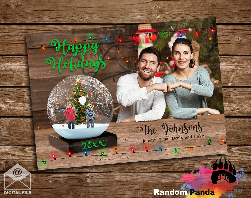 This funny Christmas card features your children photoshopped inside a snow globe while the parents fist bump, play video games or a similar position on the outside. This keepsake photoshop Holiday card is bright, colorful and perfect for a funny Xmas greeting card idea.
