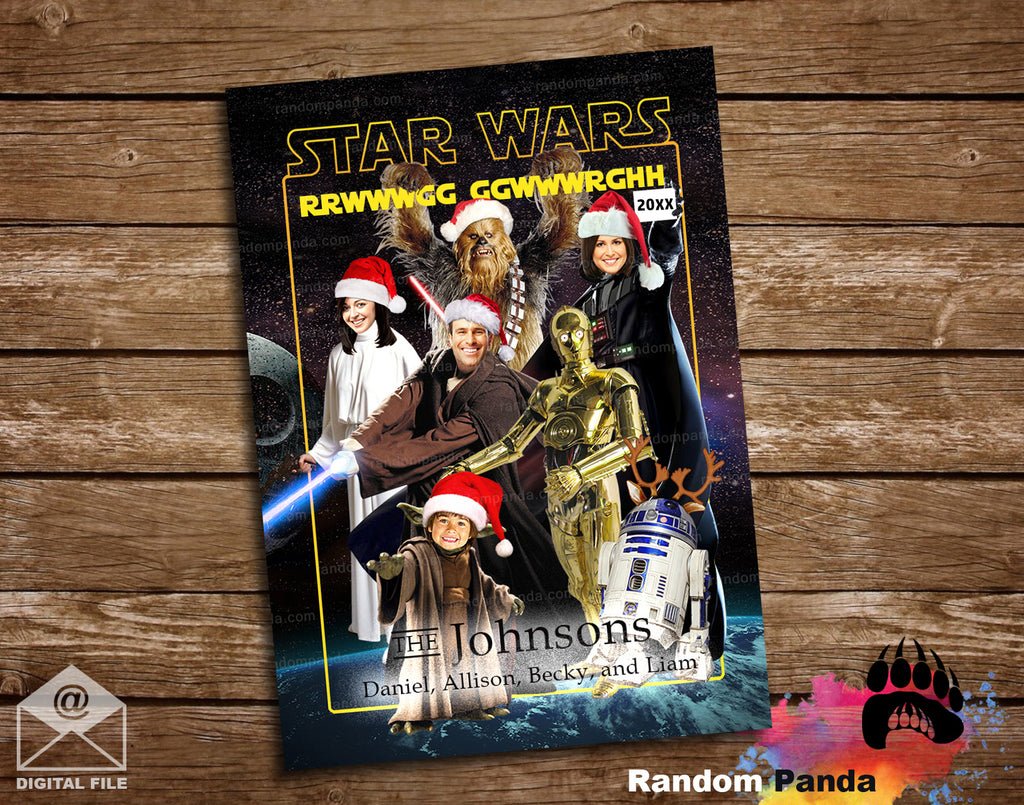 This funny Christmas card features your family photoshopped as Star Wars characters- Darth Vader, Jedi Skywalker, Princess Leia, Chewbacca, C3PO, R2D2, Mando or Boba Fett. This keepsake photoshop Holiday card is bright, colorful and perfect for a science fiction Star Wars theme.