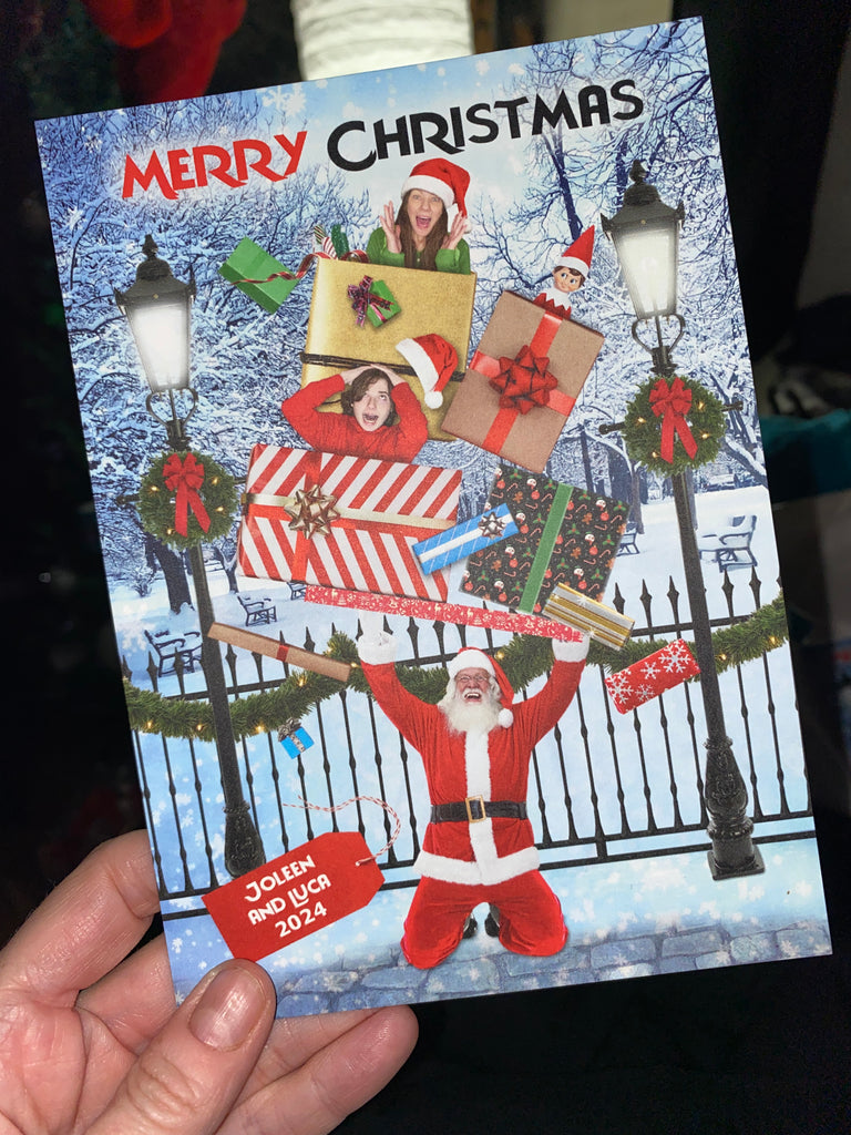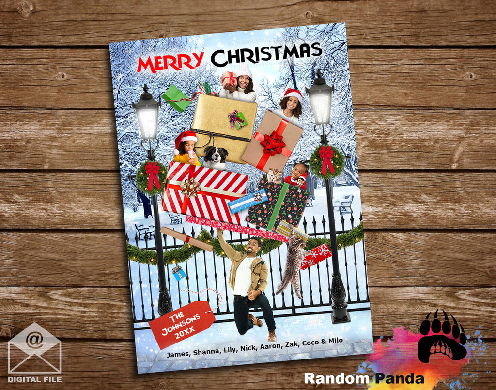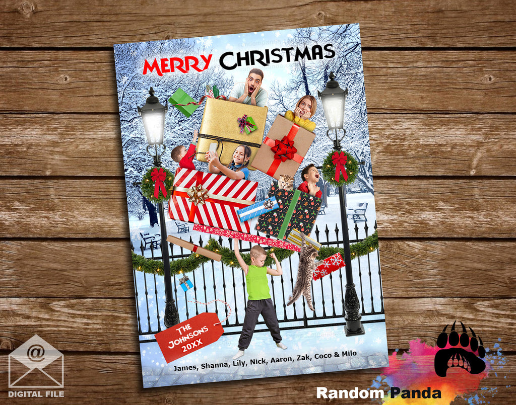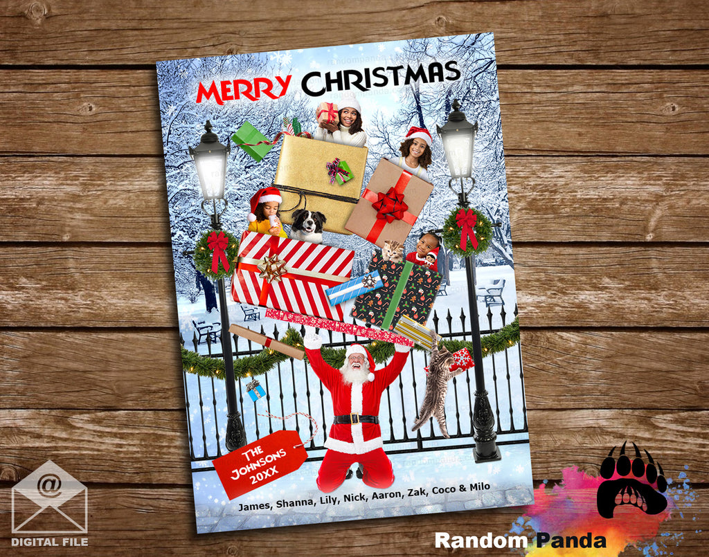 This awesome Christmas greeting card features your family photoshopped inside Christmas presents while a family member is dropping them down a snowy fenced sidewalk with street lamps and wreaths. This keepsake photoshop Holiday card is bright, colorful and perfect for a funny Xmas card idea.