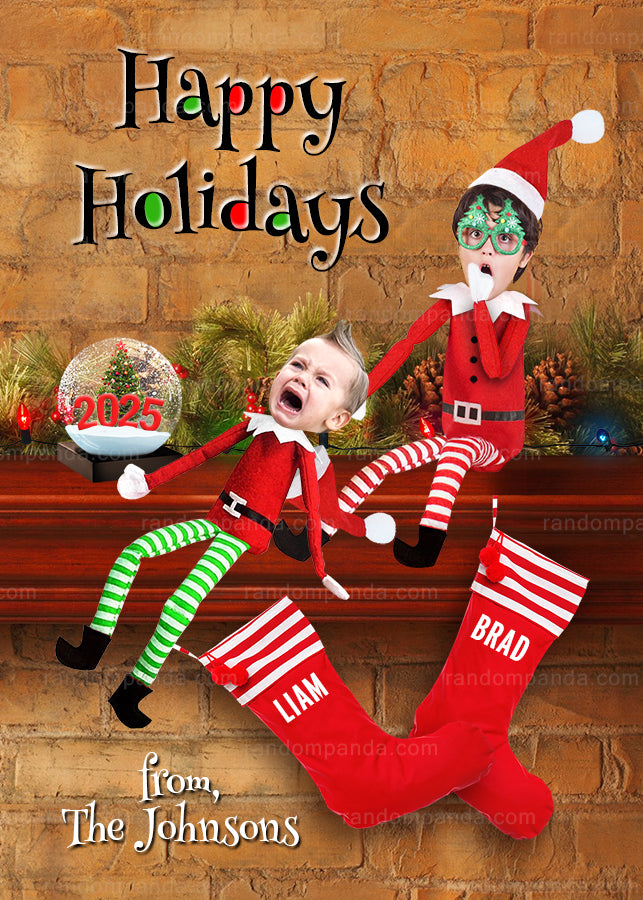 This funny Christmas card features your family photoshopped as elves while one pushes another off a fireplace mantel with personalized named stockings. This keepsake photoshop Holiday greeting card is bright, colorful and perfect for a funny Xmas elf card idea.